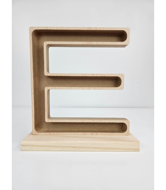 Letra E con peana en madera maciza de 22mm, con interior hueco para que puedas decorarla con flores secas, luces LED, musgo o cualquier idea creativa. Perfecta para regalos, bodas, eventos o como pieza única para tu hogar. ¡Personalízala y dale vida a tu estilo!.
