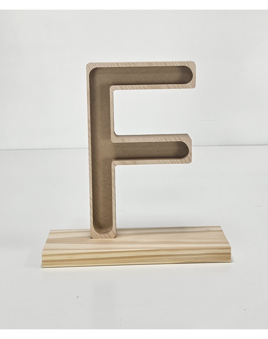 Letra F con peana en madera maciza de 22mm, con interior hueco para que puedas decorarla con flores secas, luces LED, musgo o cualquier idea creativa. Perfecta para regalos, bodas, eventos o como pieza única para tu hogar. ¡Personalízala y dale vida a tu estilo!.