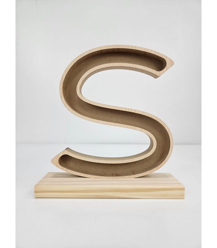 Letra S con peana en madera maciza de 22mm, con interior hueco para que puedas decorarla con flores secas, luces LED, musgo o cualquier idea creativa. Perfecta para regalos, bodas, eventos o como pieza única para tu hogar. ¡Personalízala y dale vida a tu estilo!.