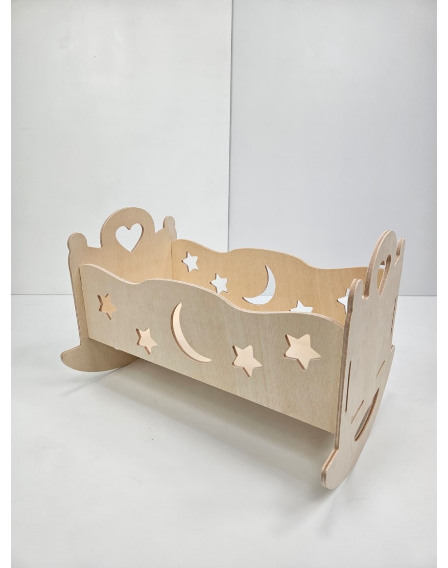 Cuna elaborada en madera de alta calidad. Esta cuna decorativa presenta un diseño único con agujeros tallados en forma de estrellas y lunas, creando un efecto luminoso y mágico cuando la luz la atraviesa.